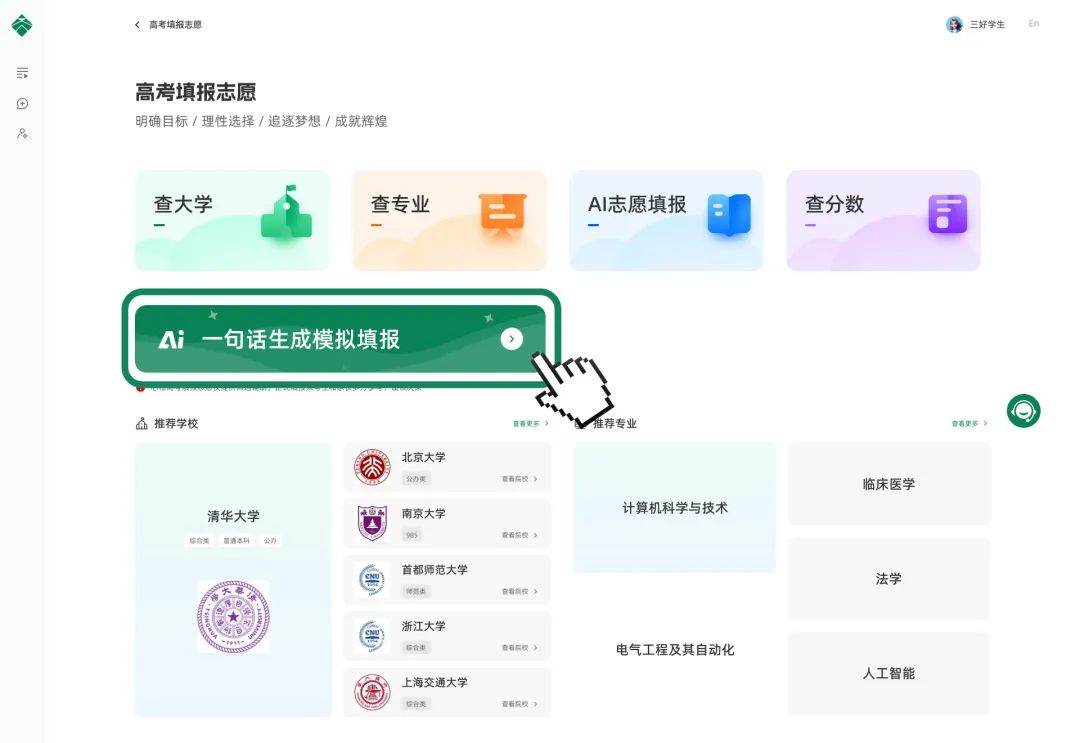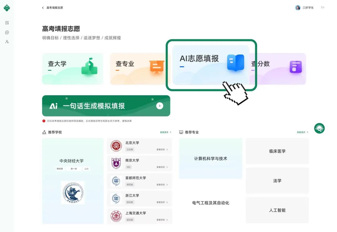 點擊AI志愿填報,系統(tǒng)會根據(jù)所選擇的高考信息進(jìn)行智能推薦