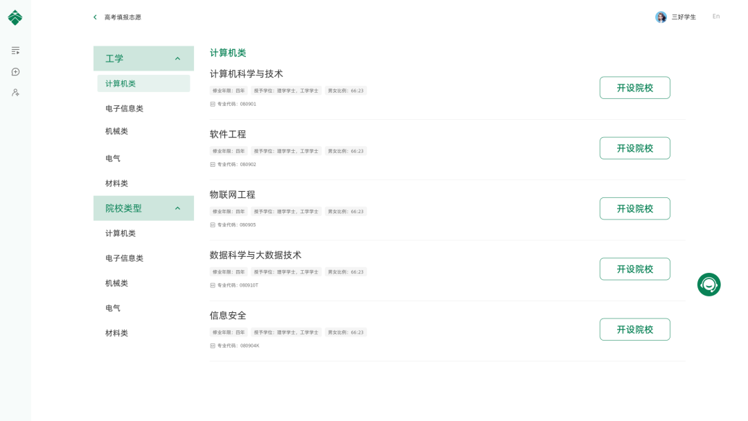 提供不同專業(yè)分類,標(biāo)識專業(yè)類型,修業(yè)年限、男女比例,詳盡羅列對應(yīng)專業(yè)開設(shè)的院校
