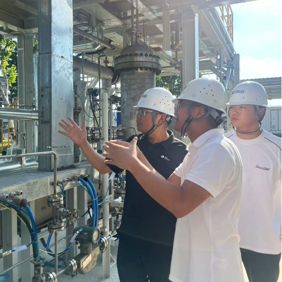 在技術(shù)人員的帶領(lǐng)下,我校師生團(tuán)隊(duì)系統(tǒng)參觀(guān)了該項(xiàng)目的原料氣閥組、壓縮系統(tǒng)、反應(yīng)單元、中控室及分析檢測(cè)中心等關(guān)鍵區(qū)域,深入了解了甲醇合成催化劑的研發(fā)進(jìn)展與工程流程。期間,師生圍繞二氧化碳資源化利用的技術(shù)瓶頸、產(chǎn)業(yè)化模式及人才需求等問(wèn)題,與項(xiàng)目一線(xiàn)工程師展開(kāi)深度交流。