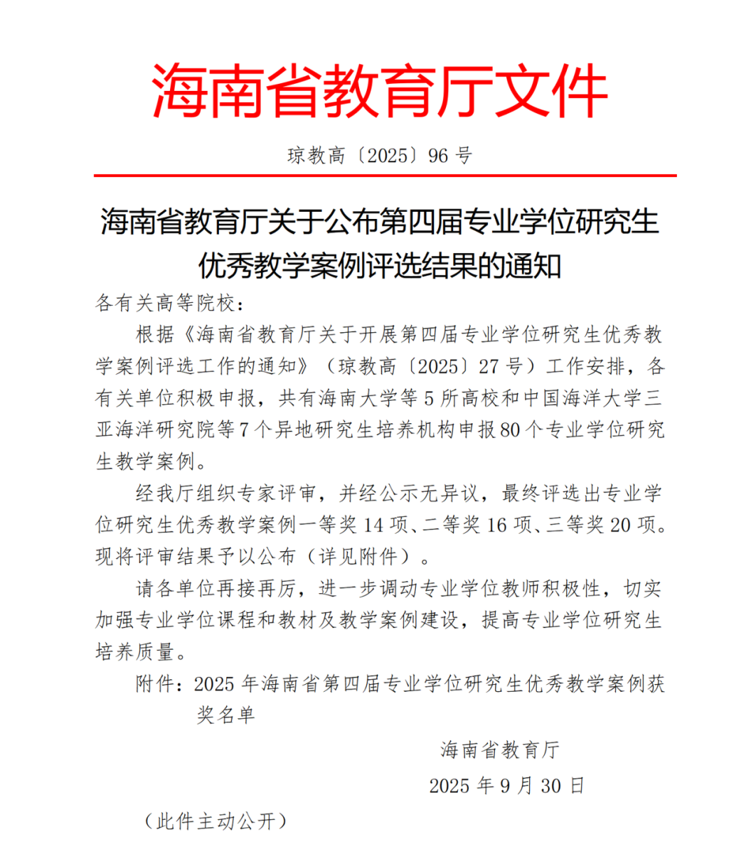 近日,海南省教育廳正式發(fā)布《海南省教育廳關(guān)于公布第四屆“優(yōu)秀研究生導(dǎo)師”和“優(yōu)秀研究生導(dǎo)師團(tuán)隊(duì)”評(píng)選結(jié)果的通知》(瓊教高〔2025〕95號(hào))及《關(guān)于公布第四屆專業(yè)學(xué)位研究生優(yōu)秀教學(xué)案例評(píng)選結(jié)果的通知》(瓊教高〔2025〕96號(hào))。三亞學(xué)院社會(huì)工作專業(yè)蘇米雅教授獲頒“海南省優(yōu)秀研究生導(dǎo)師”稱號(hào),肖芒教授帶領(lǐng)的“農(nóng)村社會(huì)工作研究生導(dǎo)師團(tuán)隊(duì)”入選優(yōu)秀團(tuán)隊(duì);旅游與酒店管理學(xué)院閆靜副教授牽頭的《鄉(xiāng)土美學(xué)重構(gòu)與價(jià)值躍遷:一個(gè)濱海漁村的網(wǎng)紅蝶變》教學(xué)案例,以及新能源與智能網(wǎng)聯(lián)汽車學(xué)院王良成高級(jí)工程師牽頭的《產(chǎn)教融合導(dǎo)向的新能源汽車驅(qū)動(dòng)電機(jī)仿真建模與測(cè)試》教學(xué)案例,均榮獲三等獎(jiǎng)。